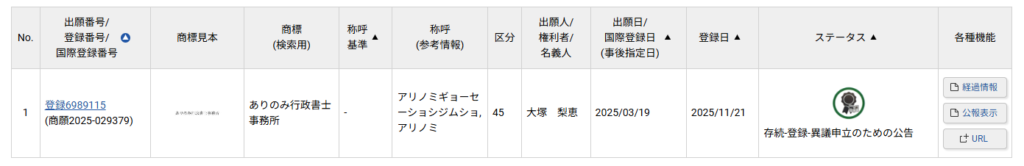 ①今年の春に「ありのみ行政書士事務所」で商標登録出願をしていたのですが、無事に登録査定が終わりました。